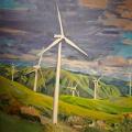 油画《天山绿电》聚焦于新疆风力发电的标志性场景——广袤天山之间,一座座风力发电机巍然屹立,叶片在光影间舒展,构成画面的视觉中心,生动展现出新疆清洁能源开发的宏伟气象。数据也为这幅画面提供了有力印证:2025年上半年,